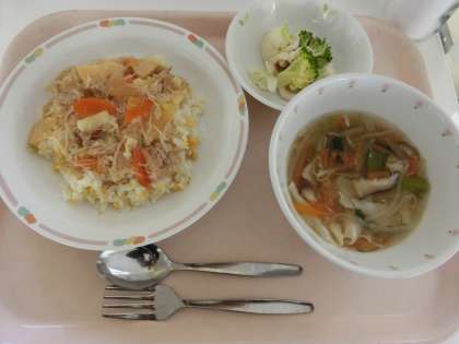 今日は給食委員の子が考えた献立です。花野菜やカニかまなど、あまり給食に出てこない食材を使っています。卵とごはんを混ぜたり、鶏肉を蒸して冷ましたりと調理作業は大変でしたが、おいしく出来上がりました。子どもも大人もよく食べていました。