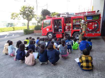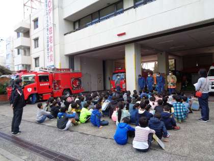 社会科「火事をふせぐ」の学習の一貫として消防署見学に行きました。