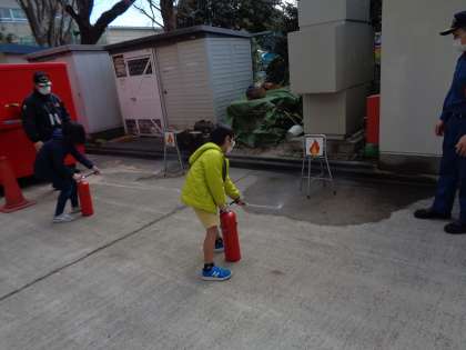 消火器の使い方やふだん見ることができない消防車の中をみて、学習を深めました。