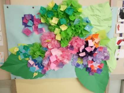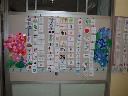 今週は、ひらがなや算数の教科書を使った学習をしました。また、図工では、「おうちで図工」で取り組んでいただいた「好きなものいっぱい」を紙テープにつなげて廊下に掲示しました。子どもたちがご家庭で折ったアジサイも廊下にきれいに咲いています。