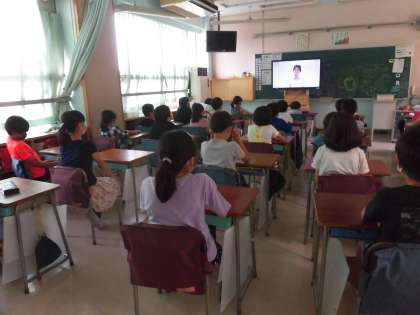 本日、5・6時間目に離任式をテレビ放送で行いました。