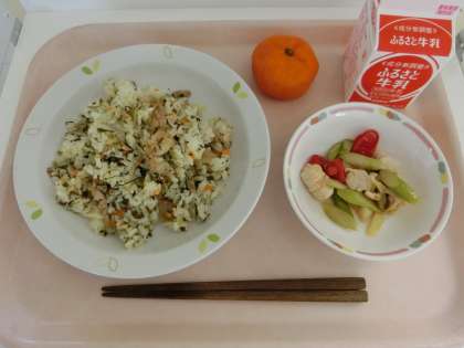 高菜の塩気とうまみのあるチャーハン、にんにくがきいた炒め物を食べた後のデザートに、さっぱりした冷凍みかんがぴったりの給食になりました。子どもたちは久しぶりに3品の給食を食べられて、とても喜んでいました。