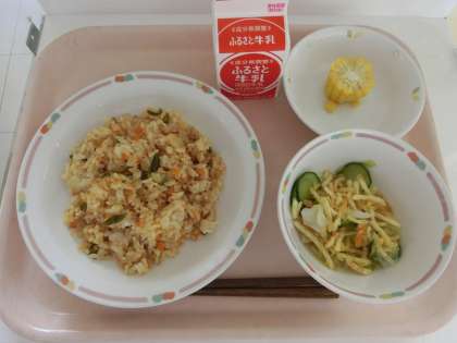 今日は蒸しとうもろこしです。蒸しただけでも甘くてジューシーで、子どもたちは「今日のとうもろこし、チョ〜おいしかった!」と嬉しそうでした。また、大人気メニュー“じゃがいものバリバリサラダ”の久しぶりの登場を喜んでいた子もたくさんいました。