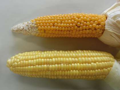 2枚目の写真は、スイートコーン(甘味種とも。普段食べているとうもろこし)とポップコーン(爆裂種とも。お菓子のポップコーンに使われるもの)の比較です。各クラスにはお便りと一緒に写真を配り、6年生には実物を見せに行きました。本当はそれぞれの実の固さの違いを実際に触って確かめてほしかったのですが…今日は触らずに、目で見て確かめるだけにしました。子どもたちは、とうもろこしにも種類があることや、種類によって色や形が違うことに感心していました。
