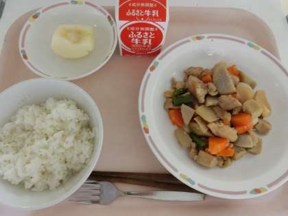 まだまだ暑いですが、これからだんだんと根菜がおいしくなる季節がやってきます。今日はそれにさきがけて根菜たっぷりの煮物です。どの具にも均等に火が入るように、切る厚さをそろえたり、下ゆでをしたりしています。子どもたちは、歯ごたえのある根菜をよく噛んで食べていました。