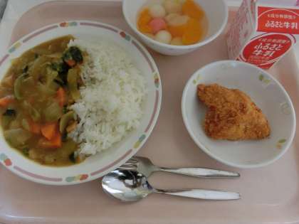 運動会目前です!今年度は赤白対抗ではないので、当日の緊張に、あるいは昨日の自分に“勝つ”!という意味でチキンカツです。お好みでカレーに入れればカツカレーにできます。紅白の白玉もちも、組分けというよりは“おめでたい”イメージで入れました。子どもたちは献立を確認すると「今日カツカレーじゃん!」と張り切って準備をしていました。