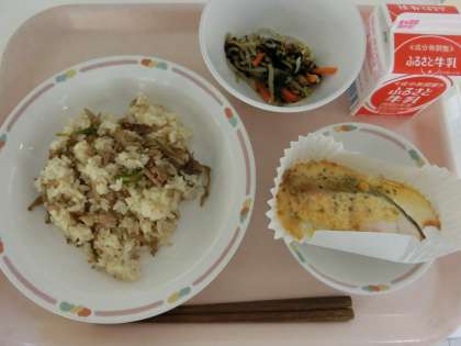 クリームコーンとマヨネーズを混ぜて、さらに粒のコーンも入った和洋折衷な魚メニューです。クセのない味のしいらに、マヨネーズとコーンのコクが加わって、満足感のある主菜になりました。子どもたちもよく食べていました。