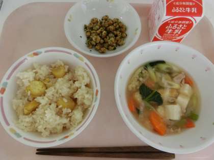 秋になったら、一度は食べたい栗ごはんです。給食では殻がむかれた状態の栗を使っています。やわらかい新米とホクホクの栗が合わさって、とてもおいしくできました。
