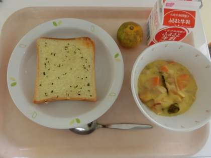 ハロウィンにちなんで、かぼちゃを使ったメニューです。デザートはみかんですが、コロンとした形とオレンジ色は、なんだかかぼちゃに通じるところがあるような、ないような…。