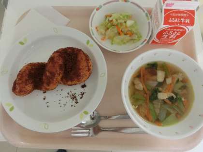 今日の揚げパンには、ココアパウダーと砂糖をまぶしています。見た目はものすごく茶色いので、低学年は最初は少し驚いた様子。しかし「この茶色いの、ココアか〜!」と納得すると、喜んで給食の準備をしていました。子どもたちは口の周りを茶色くしながら、うれしそうに食べていました。