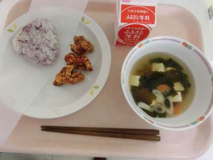 今日はたてわり遠足です。学校に帰ってきて食べる給食でも、遠足気分を楽しんでほしいなと思い、今日はごはんをおにぎりにし、お弁当の定番のからあげを出しました。