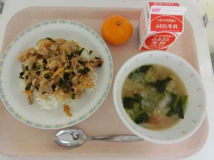キムチ豚丼のキムチは、そのまま使うと辛すぎるので、よく漬け汁を切って軽く洗ってから炒めています。少量の漬け汁で最後に辛さを調節し、低学年はほんのり、高学年はピリ辛に仕上げました。給食をしっかり食べて、体の中から温まりましょう!