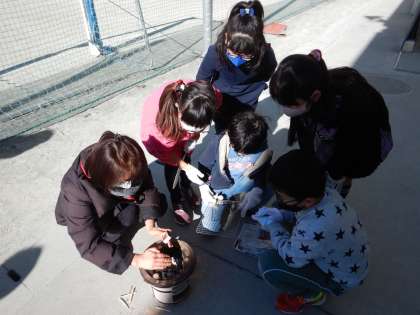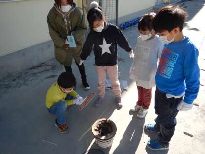 班の友達と協力し、七輪で火をおこし、お茶をわかしました。