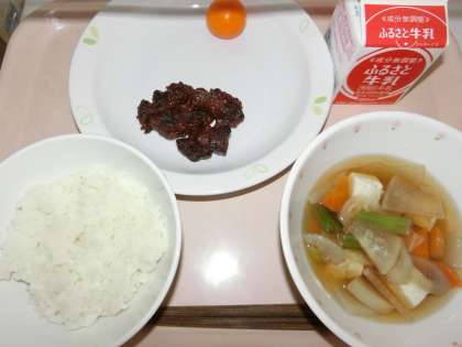果物はきんかんです。1年生は初めてきんかんを食べる子が多く、「これかじっていいの!?」「皮も食べるの!?」と驚いていました。