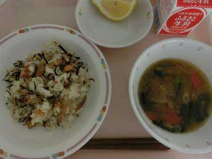 今日は節分にちなんで、大豆が入ったごはんといわしのつみれ汁です。カリカリに揚げた大豆は香ばしく、この大豆を求めておかわりに来る子もいます。つみれは、いわしのすり身にしょうがやみそなどを混ぜて、給食室で丸めて作りました。だし汁にいわしのうまみが溶け出して、とても深い味わいになりました。