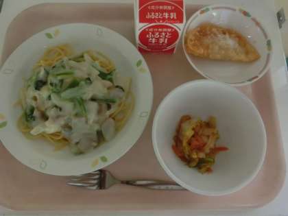 今日の給食の時間は、デザートの話でもちきりでした。今日のりんごぎょうざは、ぎょうざの皮にりんごの甘煮を包んで揚げて、砂糖をまぶしたパイ風のデザートです。最初は「これ何!?」「おかず?デザート?」と驚いていた子どもたちも、「パリパリしてる!」「りんごが入っててめっちゃおいしい」と喜んで食べていました。