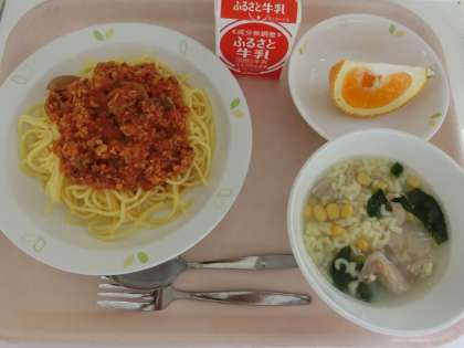今日は給食委員会の児童が考えてくれた献立です。ミートソーススパゲティも人気なのですが、それ以上に人気なのがABCスープです。ABCの歌を歌いながら陽気に給食を見に来る子や、「ちゃんとABC入れてもらえるかな…」とドキドキしている子がいました。「うちのクラスにもっとスープ入れてほしい」とみんな喜んで食べていました。