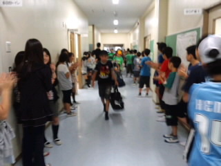 川場小学校の友だちに久しぶりに会い、はしゃぐ子どもたち。