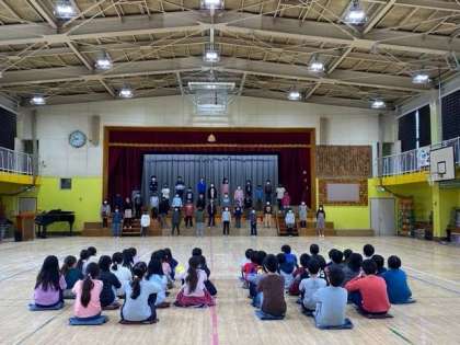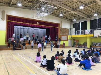 二分の一成人式の全体発表を3年生に向けて披露しました。