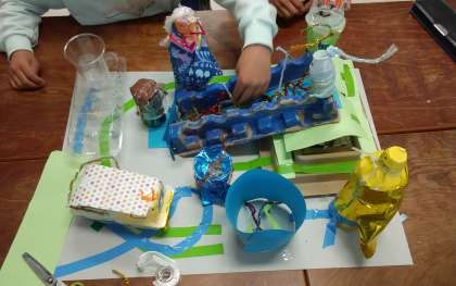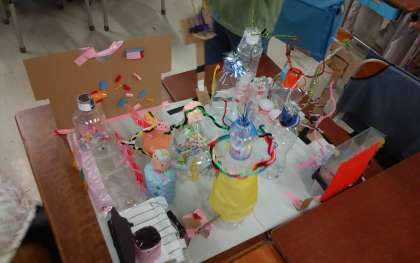 「班の友達と力を合わせて展示の仕方を工夫する」ことをめあてに、”ピコリン星とその住人のピコリン星人”を作りました。