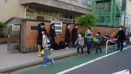 同じ学舎の船橋希望中学校の生徒が門の前に立って小学生に挨拶をしてくれます。