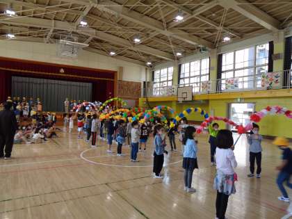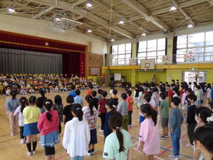 ただし、密集を避けるため全校児童が、体育館にいっぺんに集まることができません。