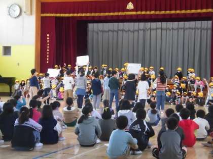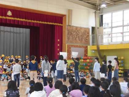 学校のルールを伝えたり、代表委員さんが考えてくれたクイズに参加したりしました。