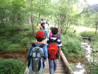そして、湖畔を歩いて湯滝を見学し、一大イベントの「戦場ヶ原ハイキング」のスタートです。行動班ごとに歩きました。中には、疲れている友だちの荷物をもってあげている子の姿も見られました。助け合い、協力することが出来たようです。