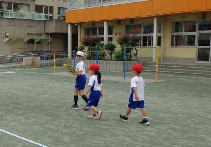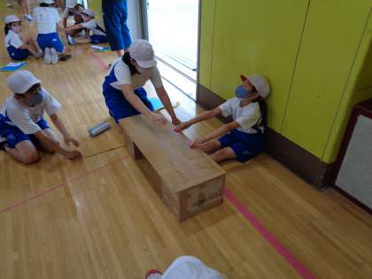 1年生が体力テストを行いました。6年生がサポートについてくれました。