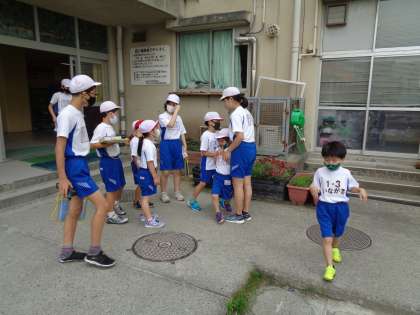 1年生は、初めての体力テストです。分からないことがたくさんあって不安ですが、6年生が優しく教えてくれて安心です。6年生は、1年生が困っているときに教えてあげたり、一緒にお話ししたりして楽しそうです。こうした取り組みを繰り返して子どもたちは絆を強くしていきます。