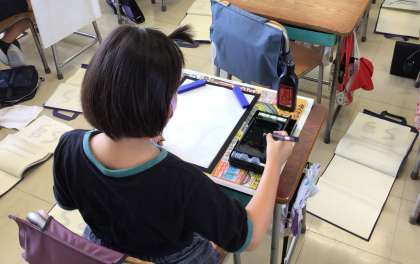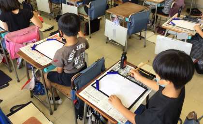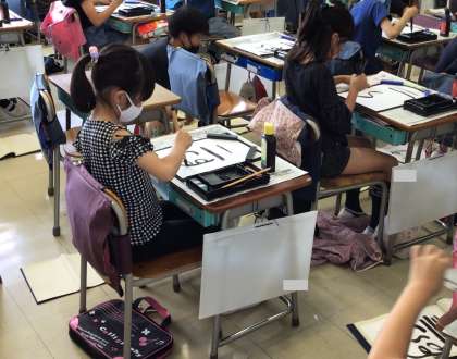 書写の授業があるときは、墨で汚れてしまう可能性があります。黒や汚れてもいい服装で登校させてください。