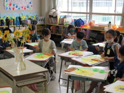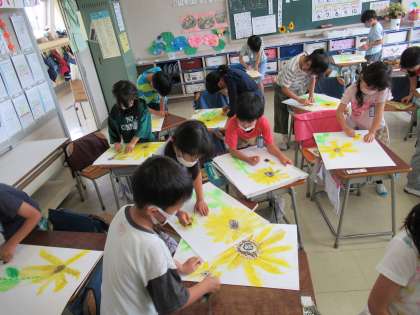 本物のひまわりを見て、はじめにクレパスを使って描きました。クレパスで描いた後に、布を使って柔らかい感じを出してみました。