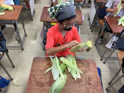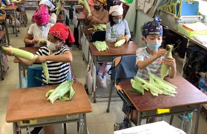 昨日は、「蒸しトウモロコシ」が給食に出て、3年生が皮むきのお手伝いをしました。
