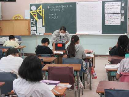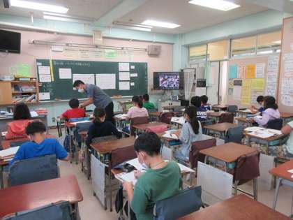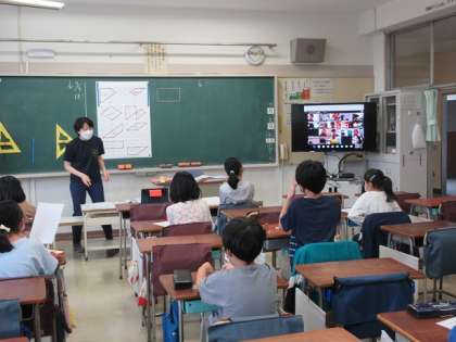 教科書を使いや黒板を使いながらですが、テレビのモニタ画面には自宅にいる友達が写っています。時折先生用のタブレットから「先生!」と聞こえてくることもあります。