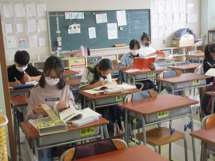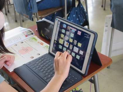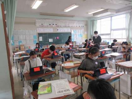 6年生の教室では、タブレットを使って学習が中心ですが、辞書を使っての学習もしっかりとやっています。