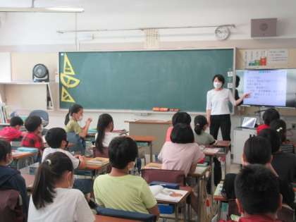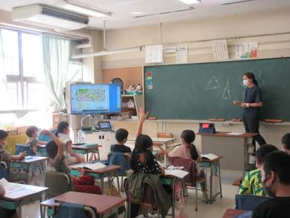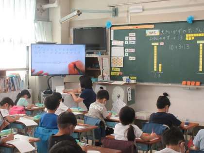 作業をする先生の手元を映し、机の上で同じ作業をしたり、デジタル教科書を映したり、黒板の代わりに使ったりしています。