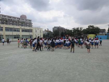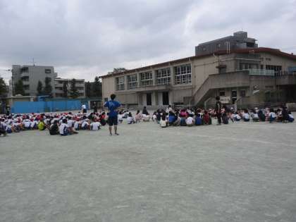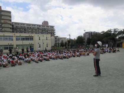 合図とともに活動をやめ、校庭の真ん中に集まり放送を聞きます。