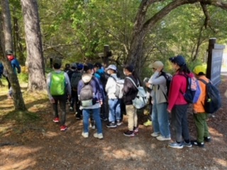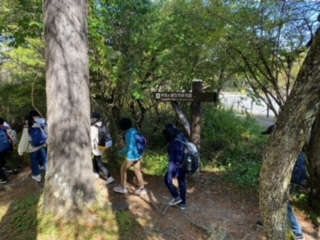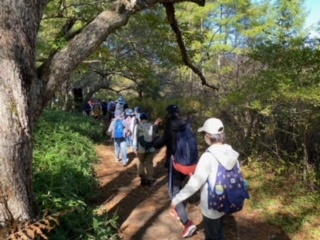 ハイキングへ出発です。この木立の中を抜けると、地面の赤いところがあり、赤沼の名前の由来です。