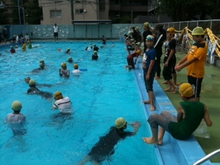 プール最後の今日、6年生が着衣水泳を行いました。海に囲まれ、美しい河川に恵まれた日本ですが、いざという時の経験がとても大切です。衣服が濡れて重くったり、まとわりついて動きにくくなること、身近にあるペットボトルやレジ袋などで浮けることを学びました。