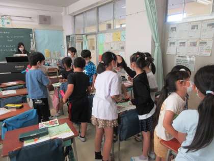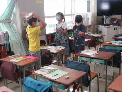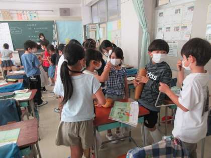 2年4組の教室です。グループで合奏をするための準備をしていました。