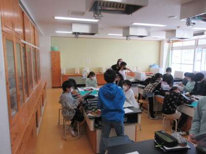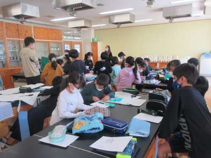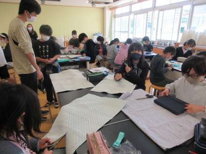 家庭科室には5年1組の子ども達が思い思いの布を広げていました。