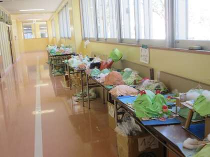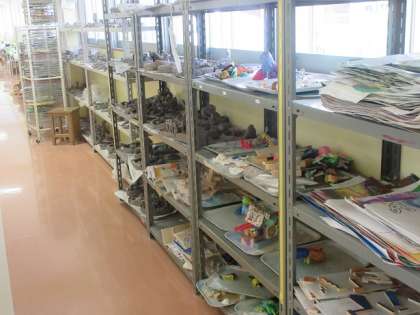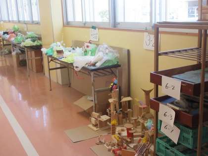 図工室前の廊下は、3年生から6年生の制作途中の作品が所狭しと置いてあります。