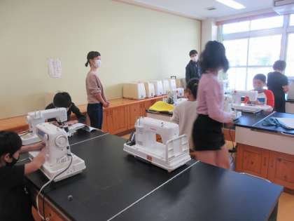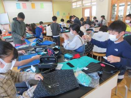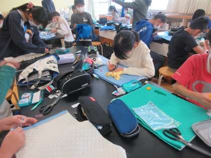 5年3組の家庭科です。展覧会出品用のトートバッグの制作中です。