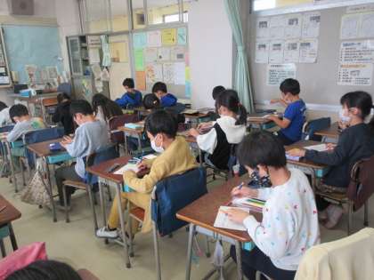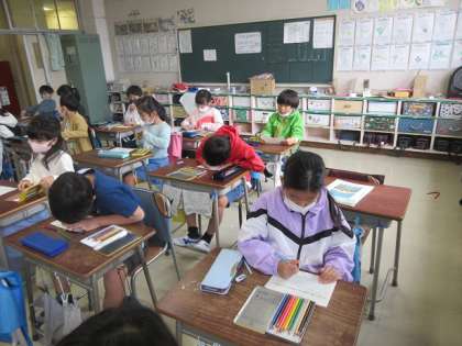 手紙を書いている2年生です。だれに書いているのかとのぞいてみると、今朝スピーチをしてくれた6年生に向けて書いています。一生懸命考えながら、一言一言丁寧に書いてます。もらった6年生は、さぞうれしいことでしょう。