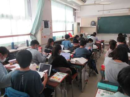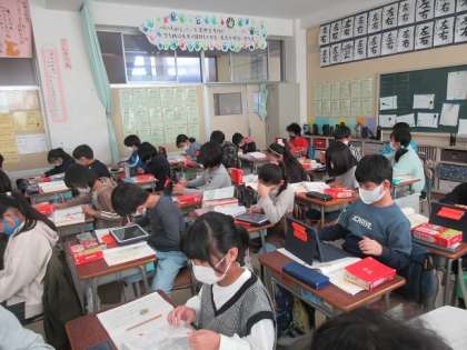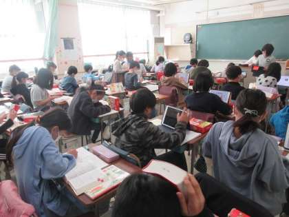 教室の中では、タブレットを開いている子もいれば、国語辞典を開いている子もいます。調べ方は違いますが、自分たちが必要と思われる情報を探すことは同じです。タブレットでも辞書でも、出てきたものを書き写すだけでは自分のものになりません。