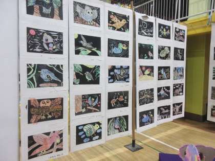 版画の作品ですが、黒のインクがほかのさまざまな色を引き立たせてくれます。6年生らしい、落ち着きを感じます。