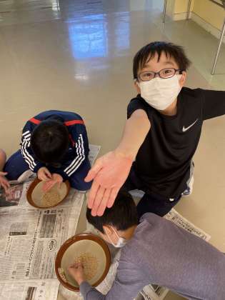 学校で収穫した稲を脱穀し、もみすりを行いました。