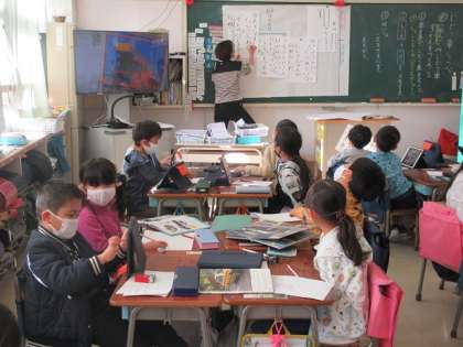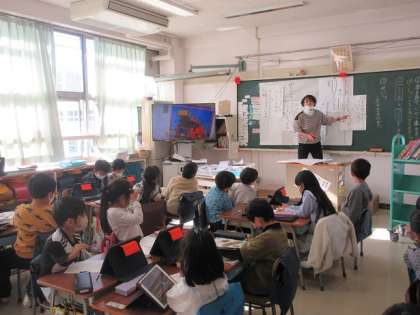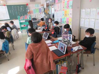 本やタブレットを使って、様々な自動車の特徴をノートにまとめます。