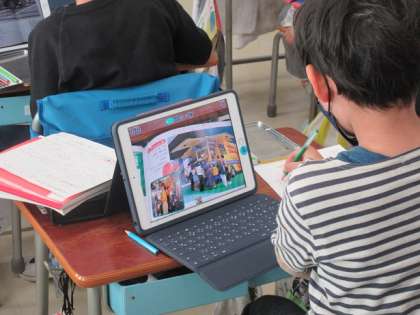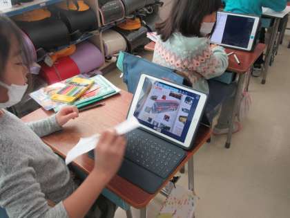 自動車に関係のある図書から、自分で調べたいページを見つけ、タブレットで撮影します。そのご、カードやノートにまとめていきます。