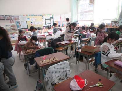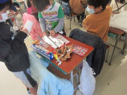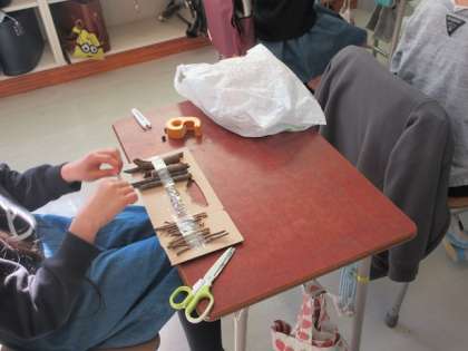 先日芦花公園で見つけてきたものや家から持ってきたものを使って、秋さがしの作品作りです。材料の色や形を生かして、いろいろなものが出来上がっています。